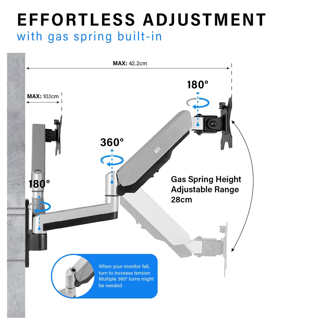 ULTi Dual Monitor Wall Mount, Gas Spring Built-in Full Motion Arm for Flat & Curved Screens, VESA, Cable Management, 32'