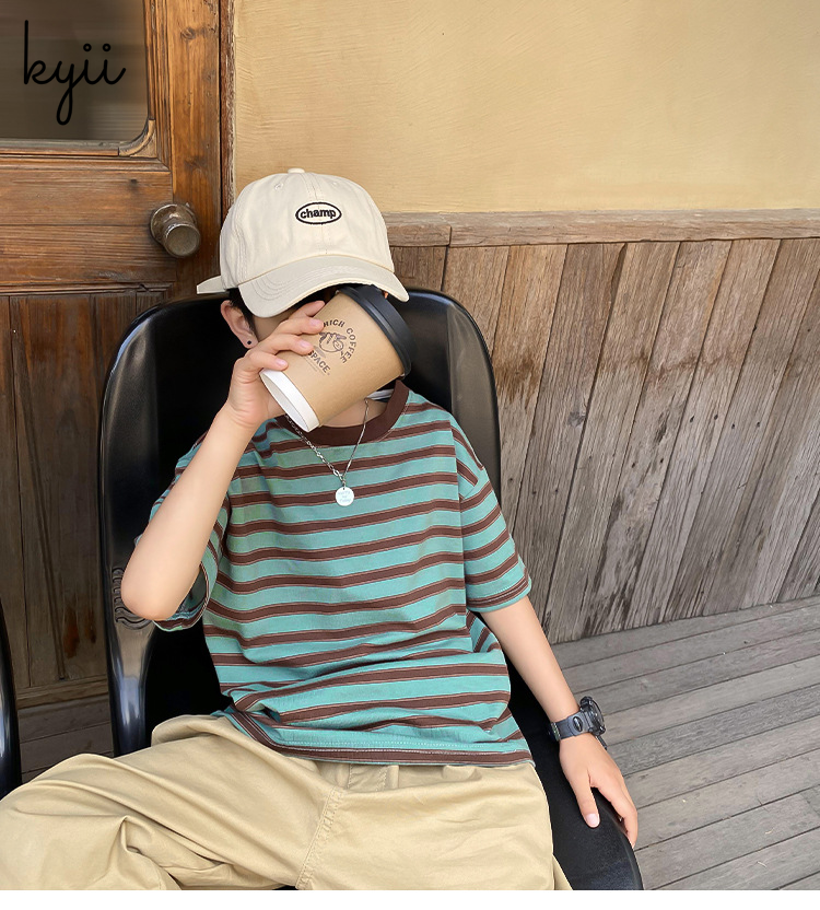 KYII stripe short sleeve Casual boys cotton summer loose shirt Korean Shirt kyb042