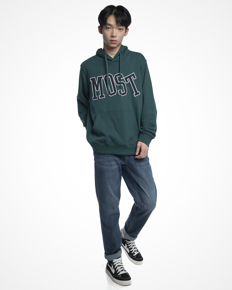 Regular Solid Coloured Long Sleeve Pullover Hoodie with Kangaroo Pockets at the front. Comes with MOST Slogan Patch at the front. Made of cotton.